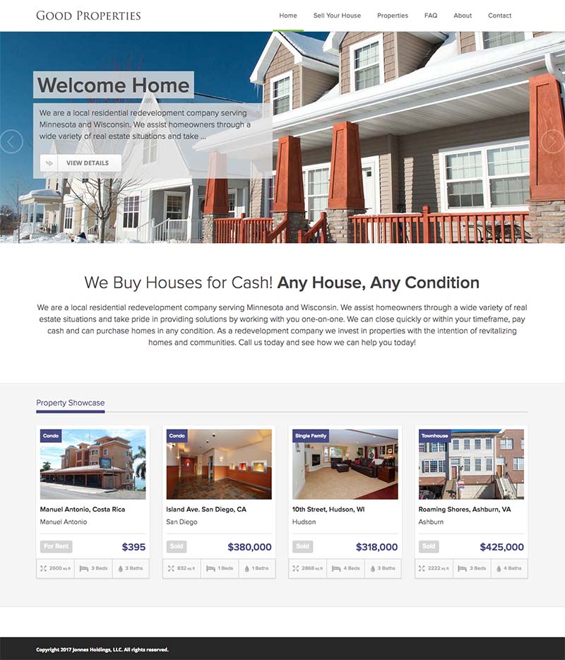 Good Properties is a real estate investment company that needed a website that served multiple purposes. One, they needed a professional web presence for visitors to learn more about their services. Two, it needed to be a lead generation site, providing details about selling their home to investors and a form to collect submissions. Three, a real estate listing showcase, to provide homebuyers information about their current listings available for sale and rent.